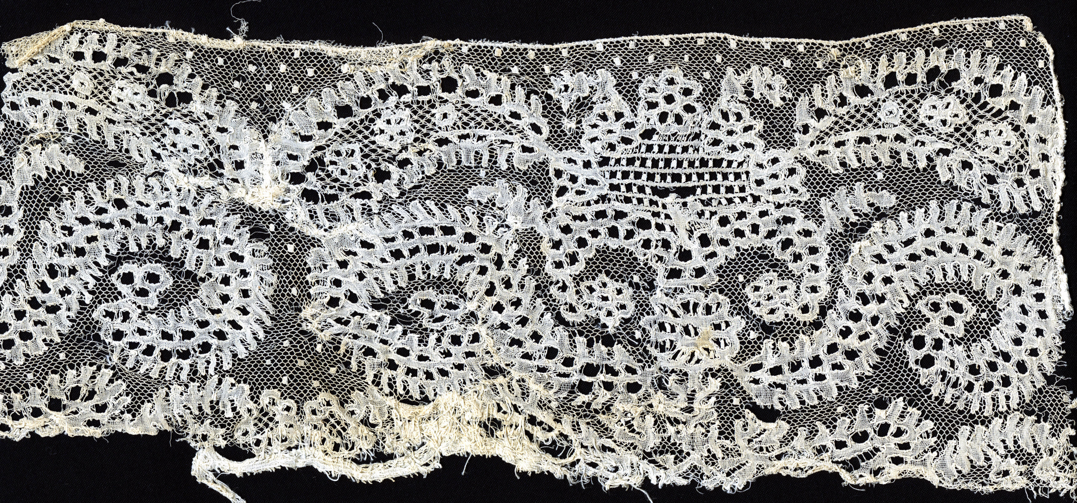 Strook Rijselse kloskant. In de kant zijn twee verschillende siergronden toegepast. De kant heeft een rapport van circa 22 centimeter.