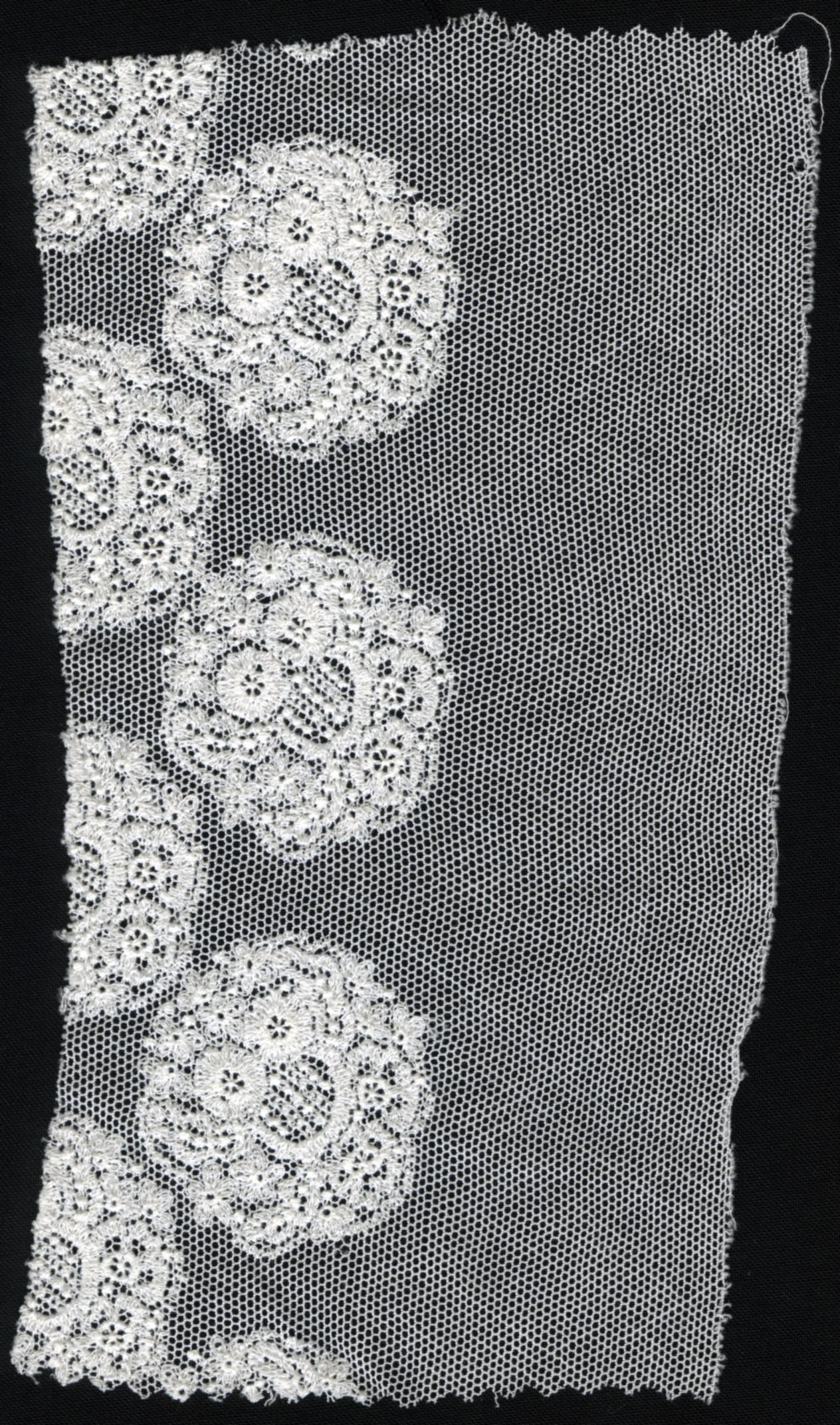 Machinaal geborduurde tule. De motieven hebben een diameter van circa 4 centimeter. Deze machinaal geborduurde tule is vervaardigd in opdracht van en verkocht door manufacturier Vloedgraven in Staphorst.