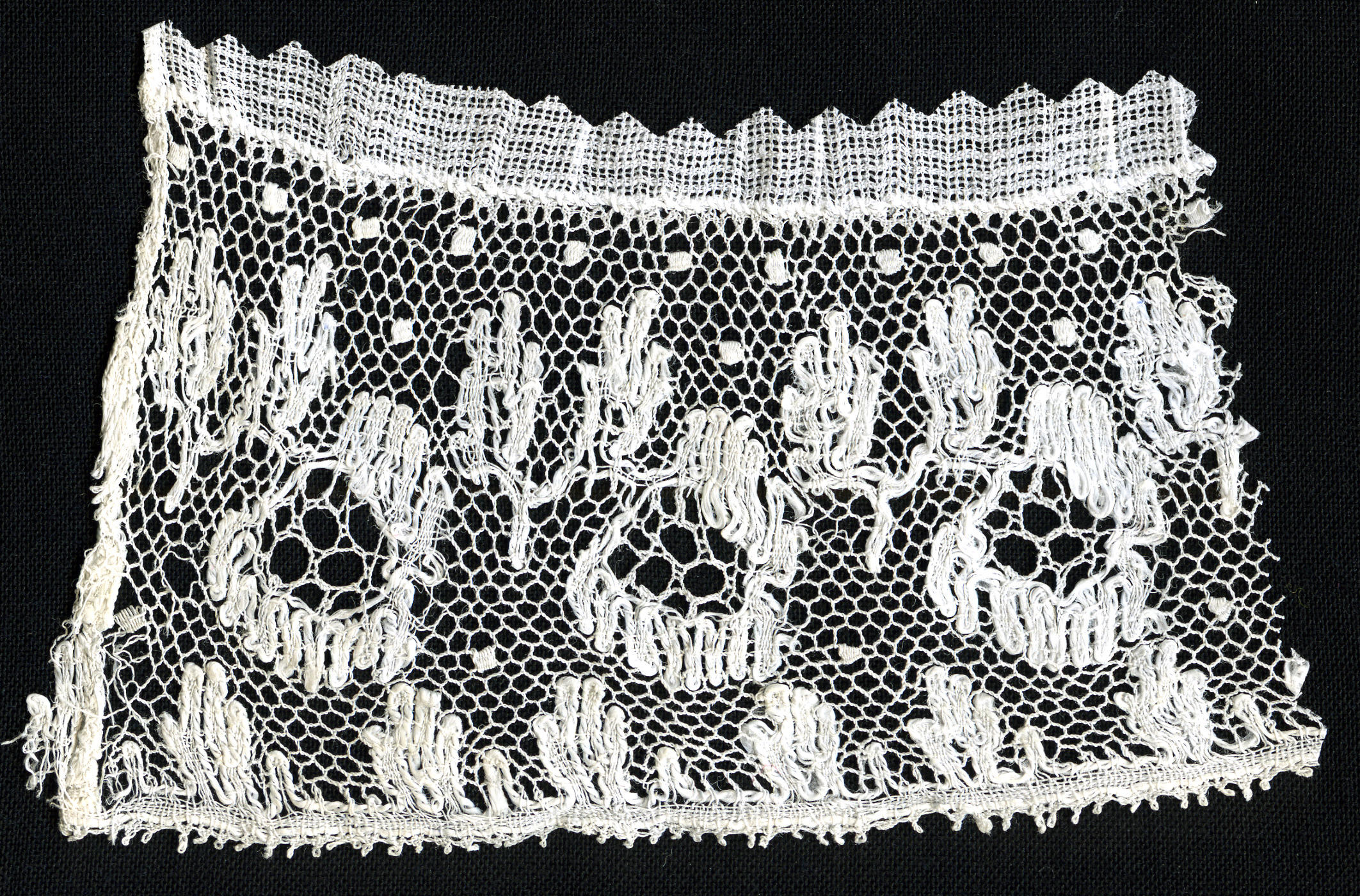 Stofstaal van Rijselse kloskant van een hul uit Bunschoten en Spakenburg. De staal is een fijne kant met een eenvoudig voorwerkje. De term 'voorwerk' is een Spakenburgse term. Hiermee worden de motiefjes langs de picotrand bedoeld. In het hoofdmotief is zogenaamde 'rozengrond' toegepast, één van de drie siergronden die voorkomen in Rijselse kanten. Het motief ...