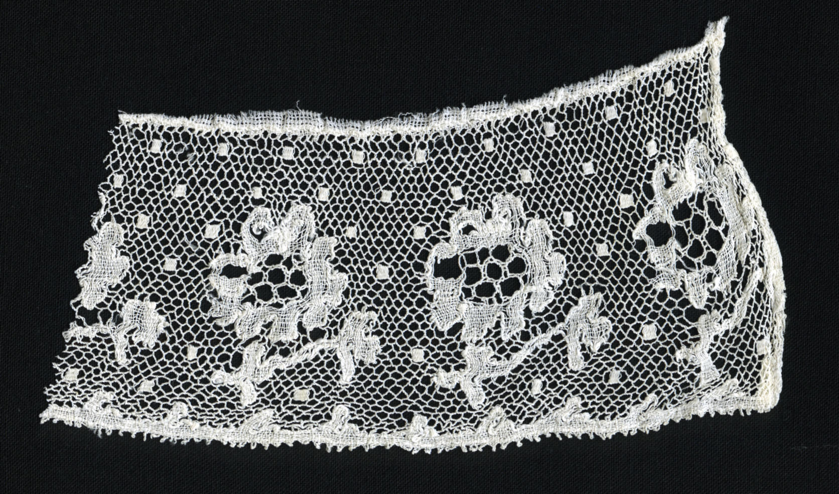Stofstaal van kloskant voor een hul uit Bunschoten en Spakenburg. Dit kantje wordt in Bunschoten-Spakenburg ‘roosjeskant’ genoemd. Roosjeskant is een Rijselse kant waarvan het bloempje lijkt op een roosje en het hart ervan altijd gevuld is met zogenaamde 'rozengrond'. Er zijn verschillende varianten roosjeskant. Deze kant is vrij eenvoudig en voor een daagse hul of ...