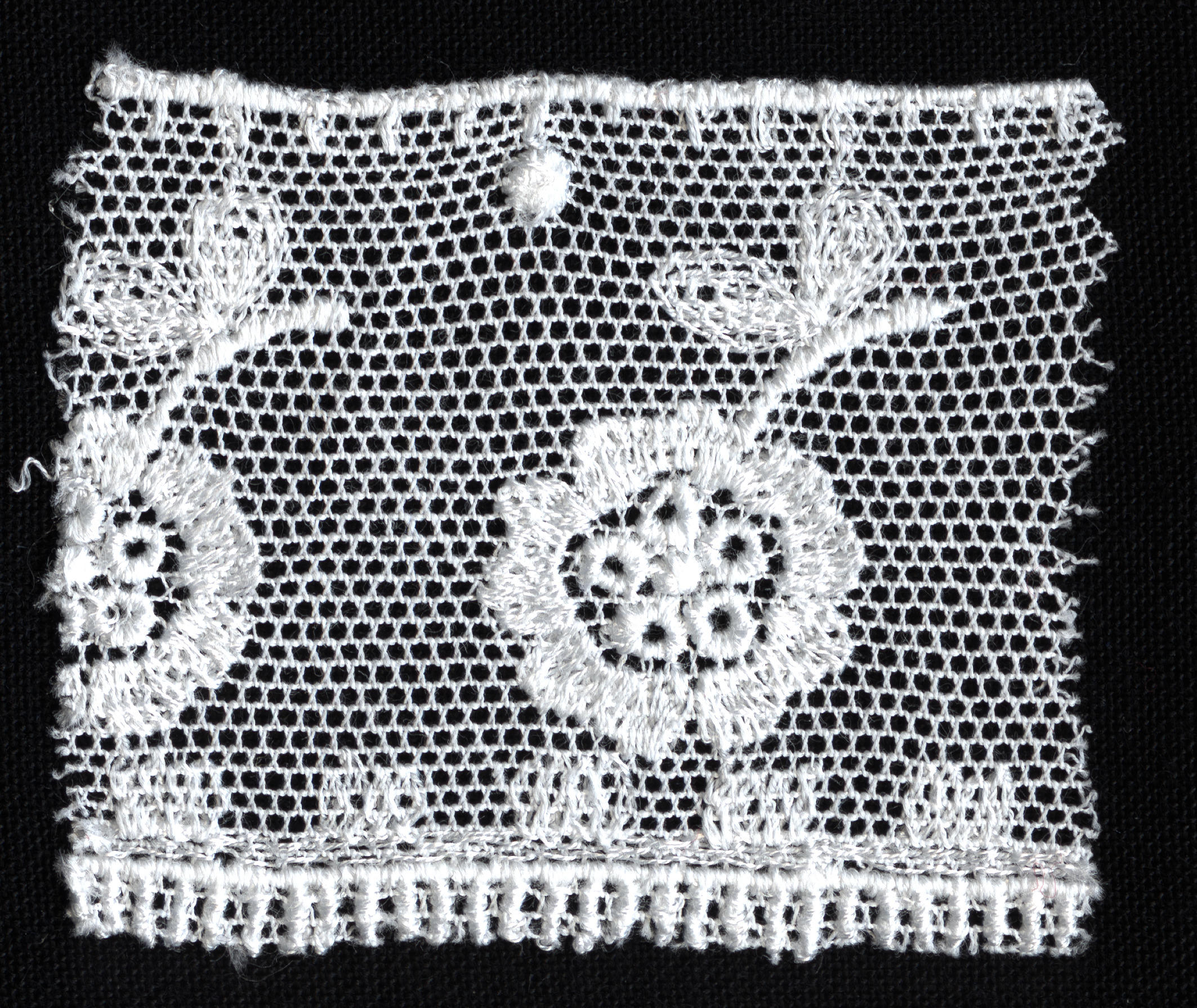 Strook machinaal geborduurde tule, gebruikt voor voorstroken aan een 'toefmuts' (kornetmuts) in Staphorst en Rouveen. Het rapport is circa 2,5 centimeter. Deze kant heeft manufacturier Vloedgraven uit Staphorst speciaal laten maken voor toefmutsen. De kant bleek niet geschikt voor achterstroken, onder meer omdat hij te zwaar was. De kant was ook niet populair voor de ...