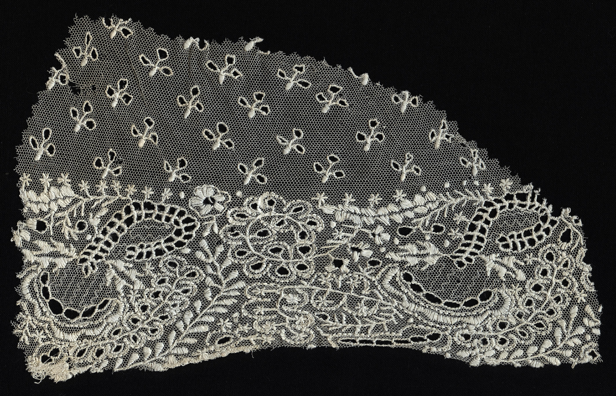 Fragment van een strook doorgestopte tule, Utrecht of Noord-Holland (staal (monster))
