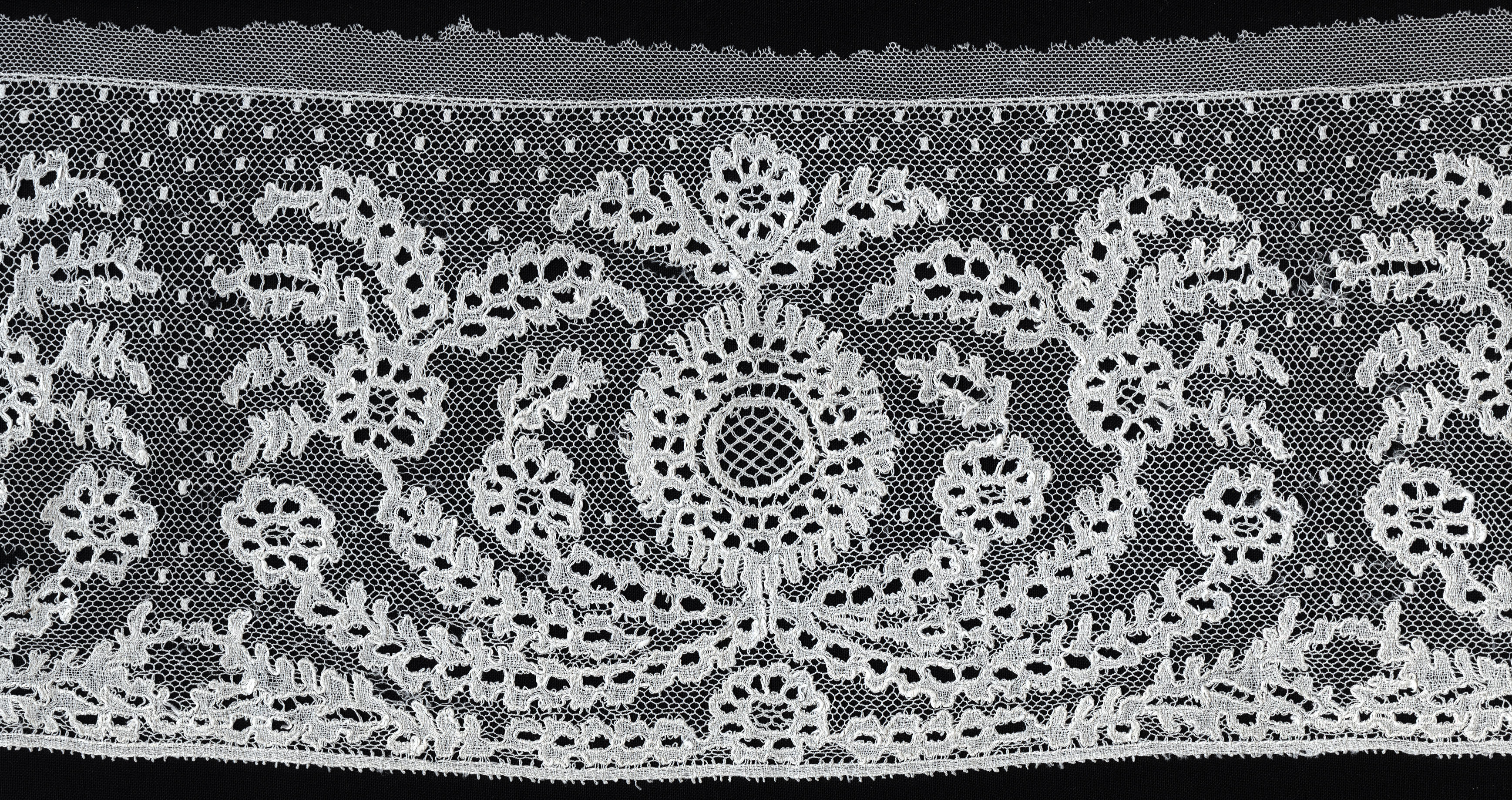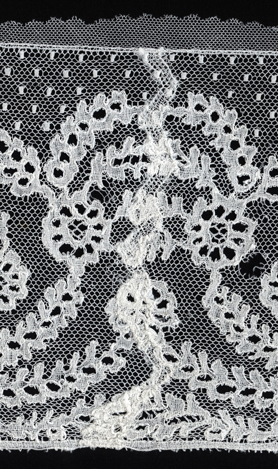 Een strook Rijselse kloskant, afkomstig van een sluiermuts uit de Hoekse Waard. De breedte van de kantstrook is circa 13 centimeter. Het rapport is ongeveer 22 centimeter. De totale lengte van de kantstrook aan de sluiermuts was circa 198 centimeter. Ongeveer 50 centimeter rechts van het midden waren de beide uiteinden van de kantstrook min ...