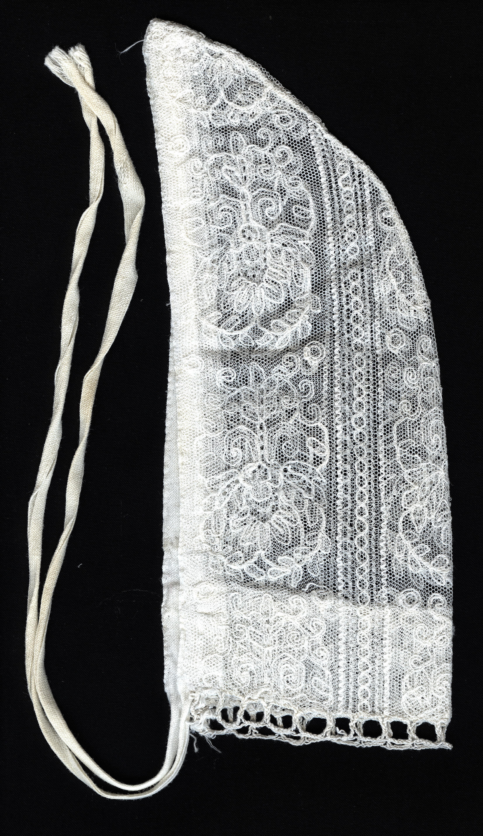 Mutsenbol van een sluiermuts uit de Hoekse Waard, vervaardigd van geborduurde tule. De bol is inclusief schuif circa 21 centimeter hoog en circa 16,5 centimeter breed. Langs de onderrand van de bol is een gehaakte schuif gezet van circa 1 centimeter breed. Tegen de binnenkant van de zoom is een wit katoenen bandje genaaid van ...