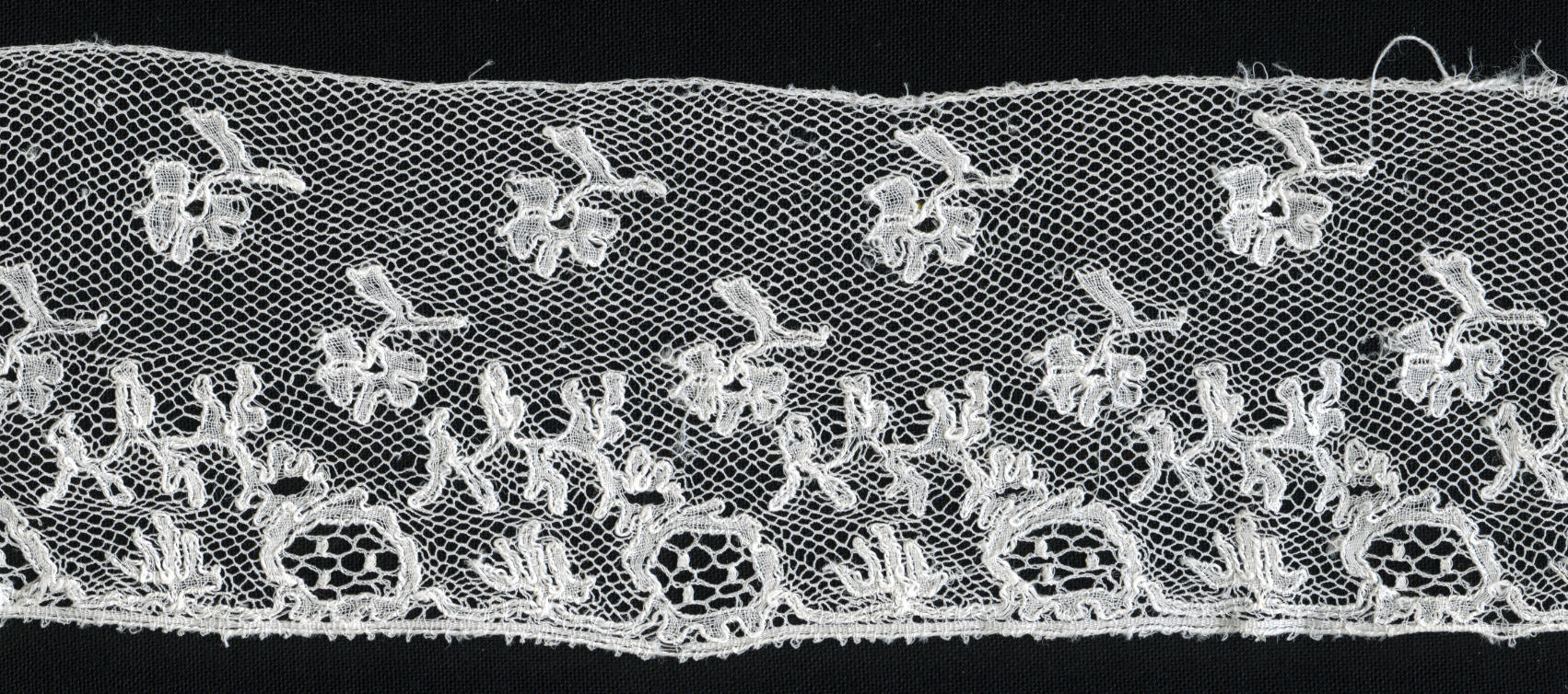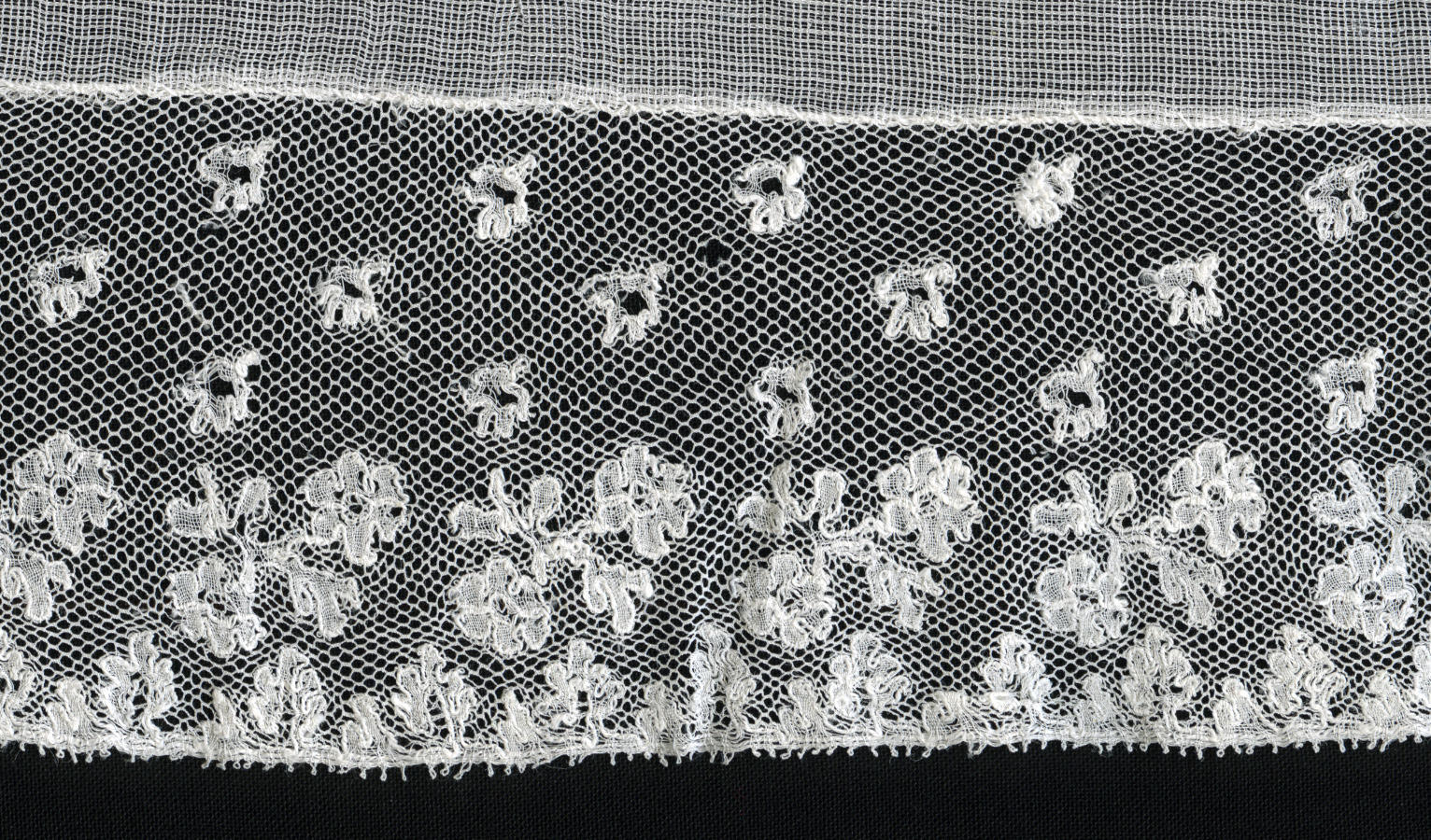 Losgetornde voorstrook van een plooimuts uit de Baronie van Breda. De voorstrook bestaat uit een strook mutsengaas, met langs de beide zijden een strook Mechelse kloskant. Dit type behoorde niet tot de beste kwaliteit Mechelse kant. Deze kanten werden vooral in Turnhout en omgeving geklost. De totale strook was dubbelgevouwen, zodanig dat beide kantstroken precies ...