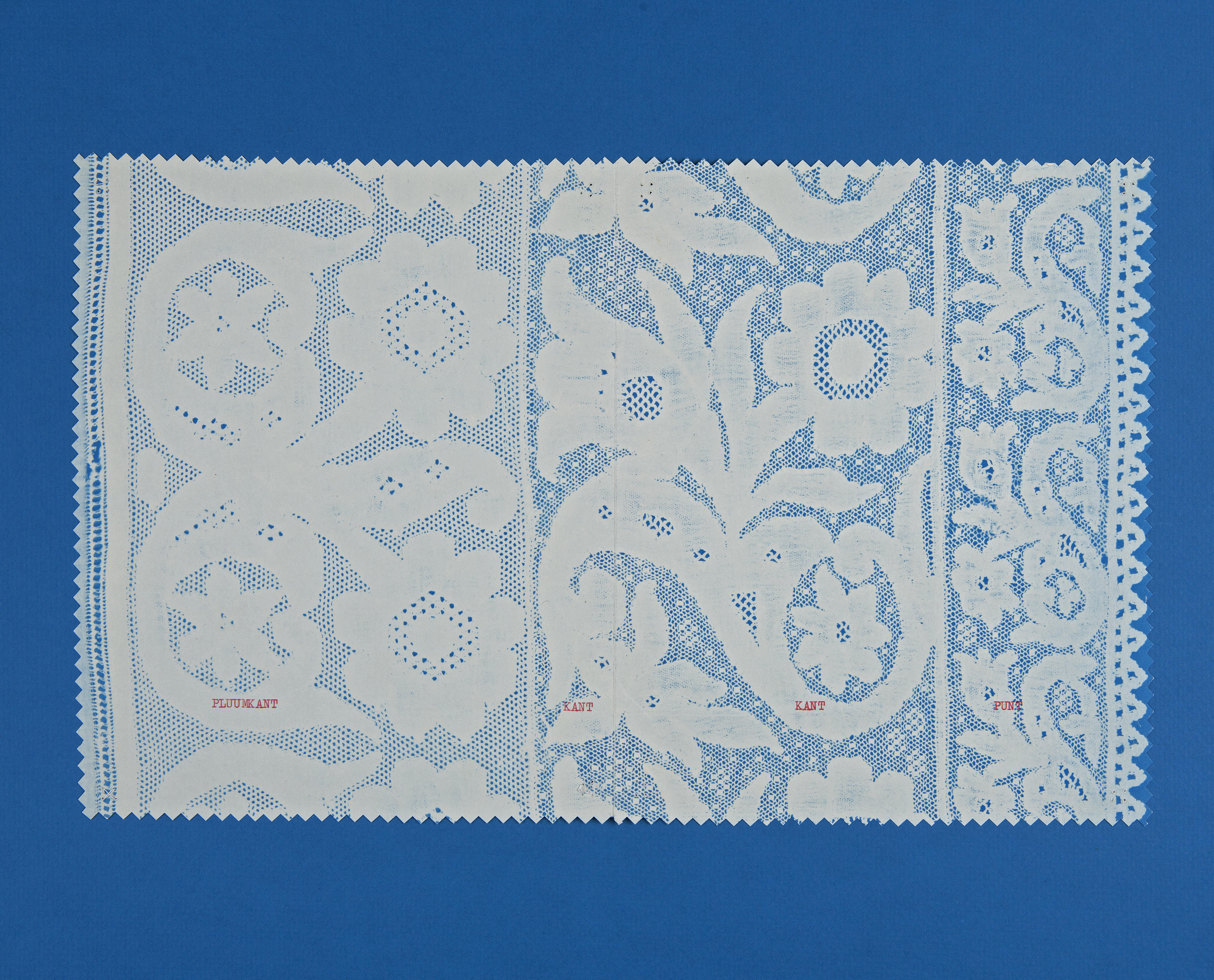 Een blauwdruk van een gedeelte van een Zuid-Bevelandse katholieke vrouwenmuts. De zogenaamde 'punt' en de 'reep' of 'kant' zijn vervaardigd van Rijselse kloskant. De 'pluumkant' is vervaardigd van Parijse kloskant. De muts dateert van omstreeks 1940. De Zuid-Bevelandse katholieke vrouwenmuts bestaat uit verschillende onderdelen. Aan de 'achtermuts' van effen batist of fijne katoen worden drie ...