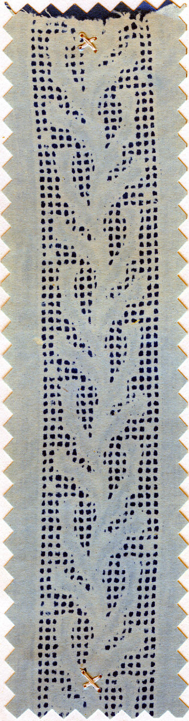 Een blauwdruk van een losse strook feston, gebruikt in een Zuid-Bevelandse protestantse vrouwenmuts. Deze losse strookjes feston werden aan de achterzijde van de bol tussen de plooitjes in de 'kuuve' (kuif) geplaatst. De blauwdruk is vervaardigd door NOM-medewerkers tijdens veldwerk.