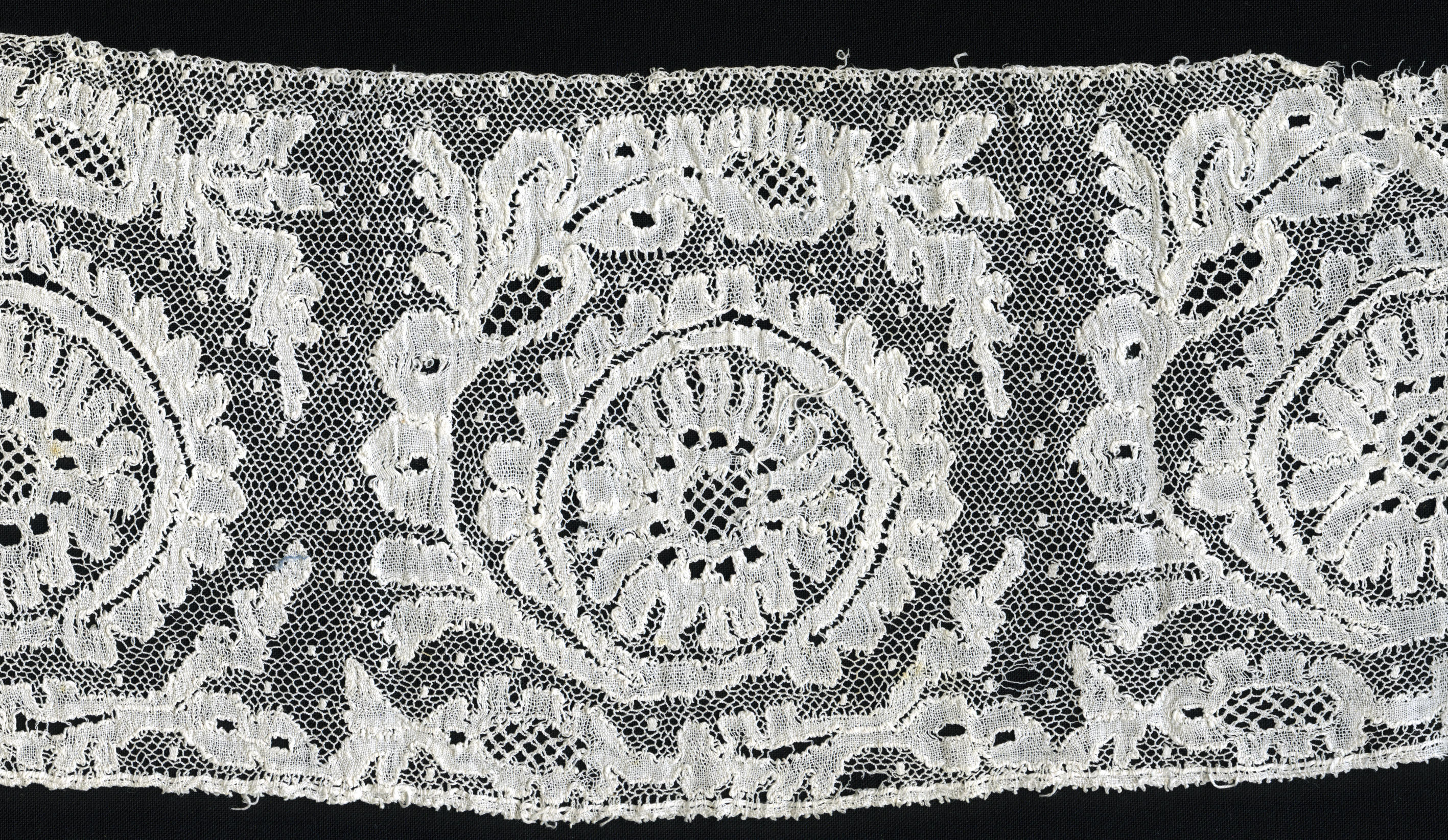 Strook Rijselse kloskant, gebruikt als ‘reep’ aan een protestantse Zuid-Bevelandse muts. Deze muts bestaat uit verschillende onderdelen. Aan de 'achtermuts' van effen batist of fijne katoen worden drie kantstroken gezet, achtereenvolgens de 'pluumkant', de 'reep' of 'kant' en de 'punt'. In de motieven zijn verschillende siergronden toegepast. Aan beide uiteinden is de strook met de ...