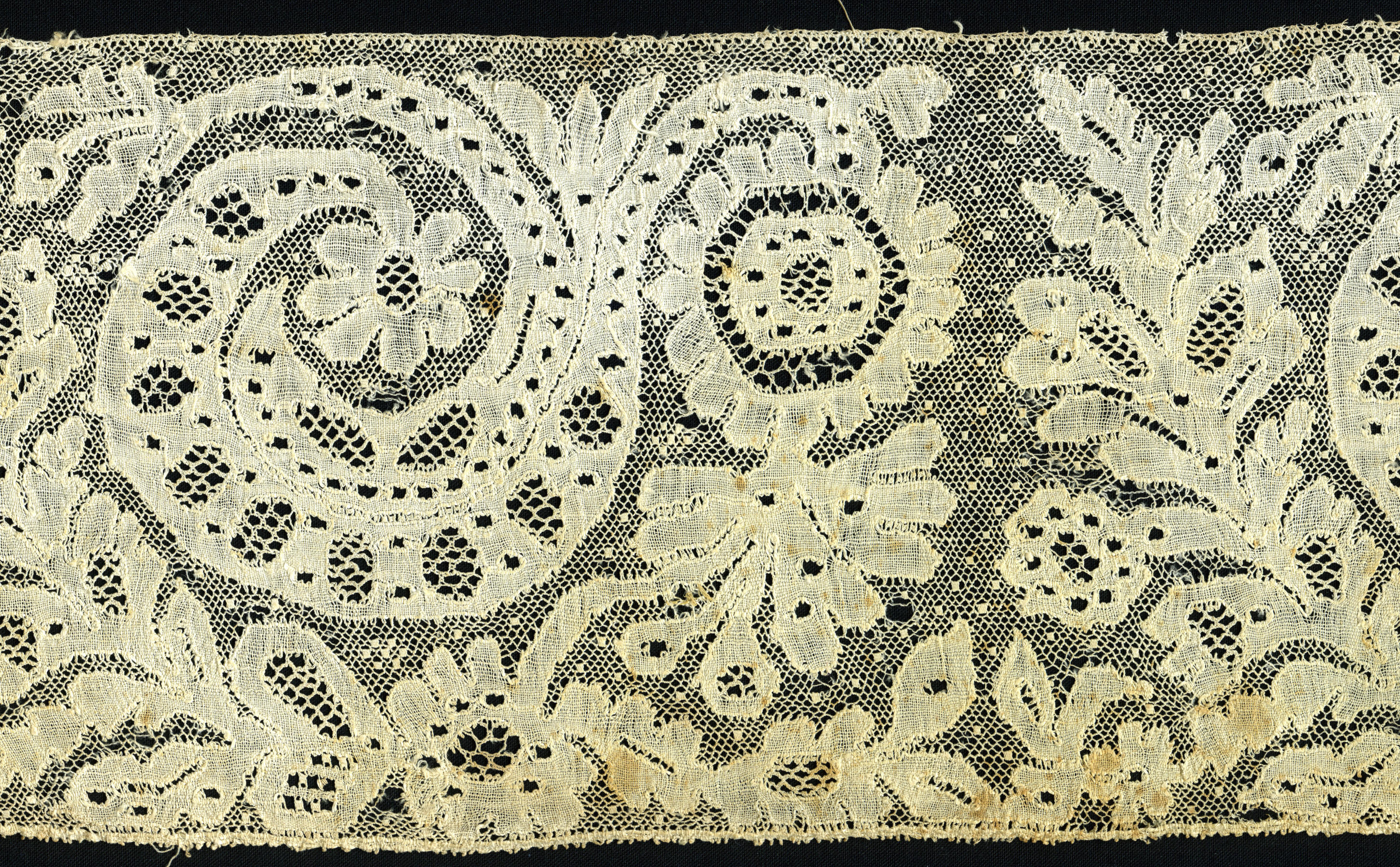 Strook Rijselse kloskant, afkomstig van een ‘reep’ van een protestants Zuid-Bevelandse muts. In de motieven zijn verschillende siergronden toegepast. Aan één uiteinde is de strook met de hand gezoomd. Het rapport is circa 18 centimeter. De oorspronkelijke reep was circa 98 centimeter lang.