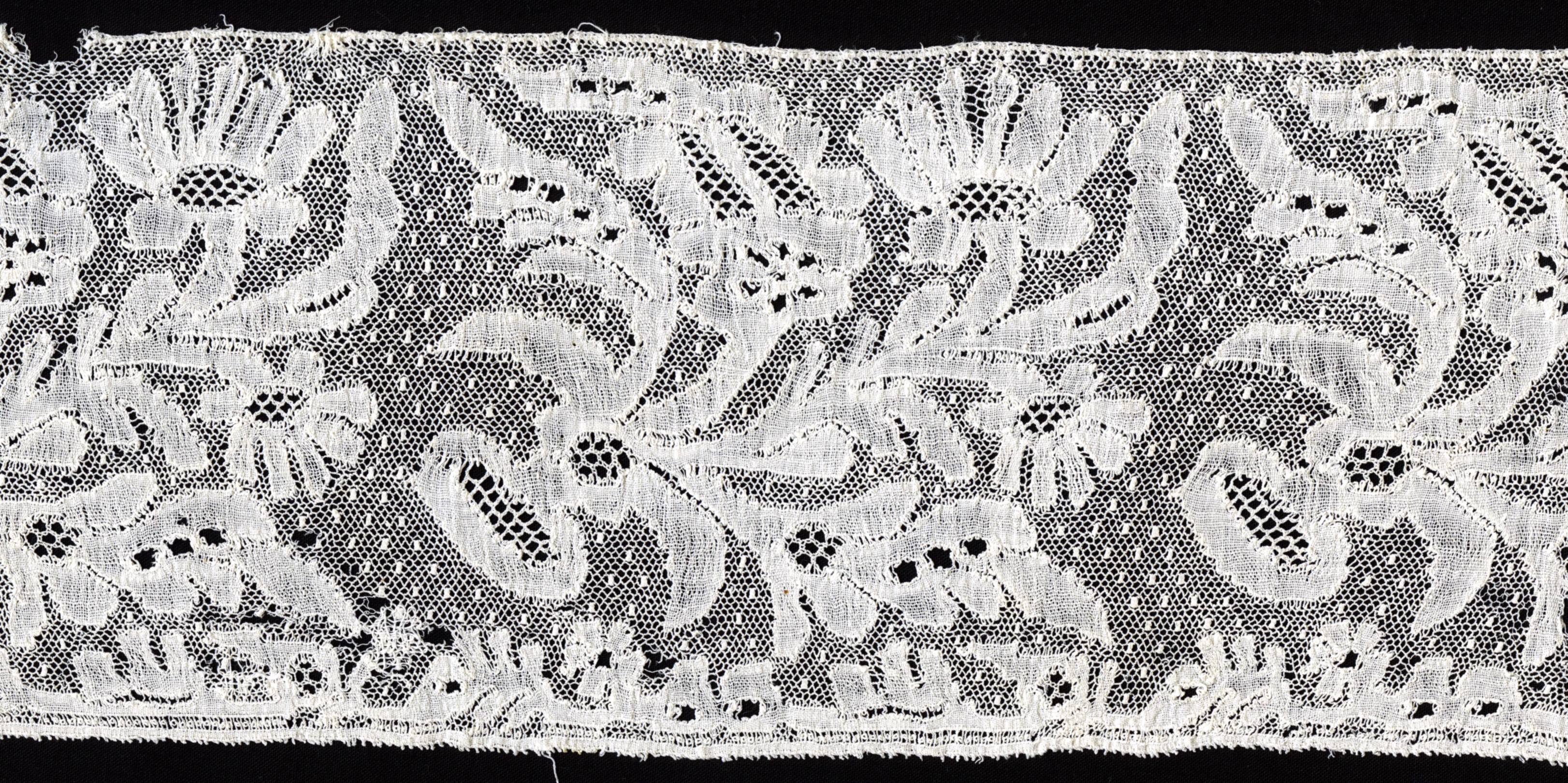 Strook Rijselse kloskant, gebruikt als ‘reep’ aan een protestantse Zuid-Bevelandse muts. Deze muts bestaat uit verschillende onderdelen. Aan de 'achtermuts' van effen batist of fijne katoen worden drie kantstroken gezet, achtereenvolgens de 'pluumkant', de 'reep' of 'kant' en de 'punt'. In de motieven zijn verschillende siergronden toegepast. Aan beide uiteinden is de strook met de ...