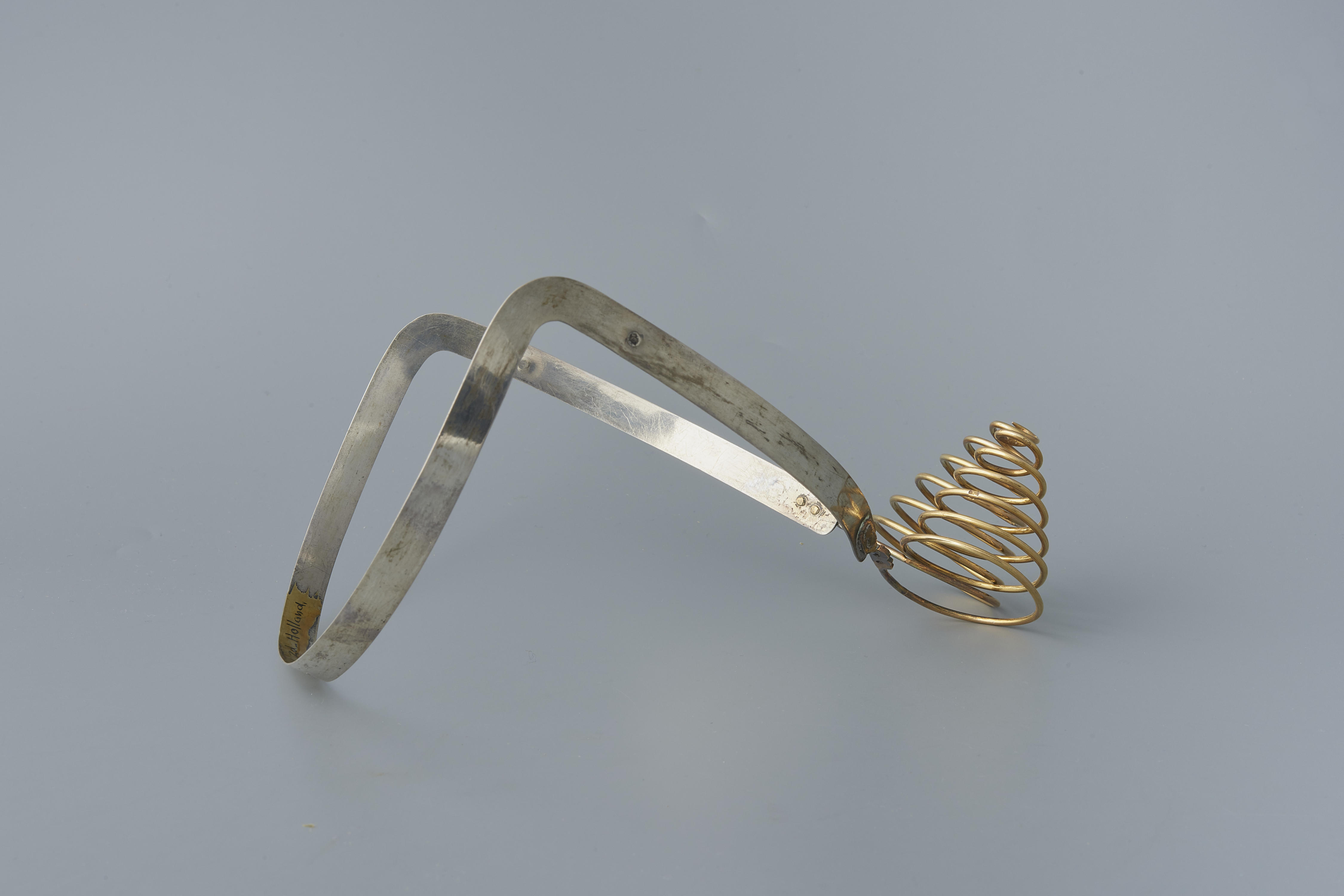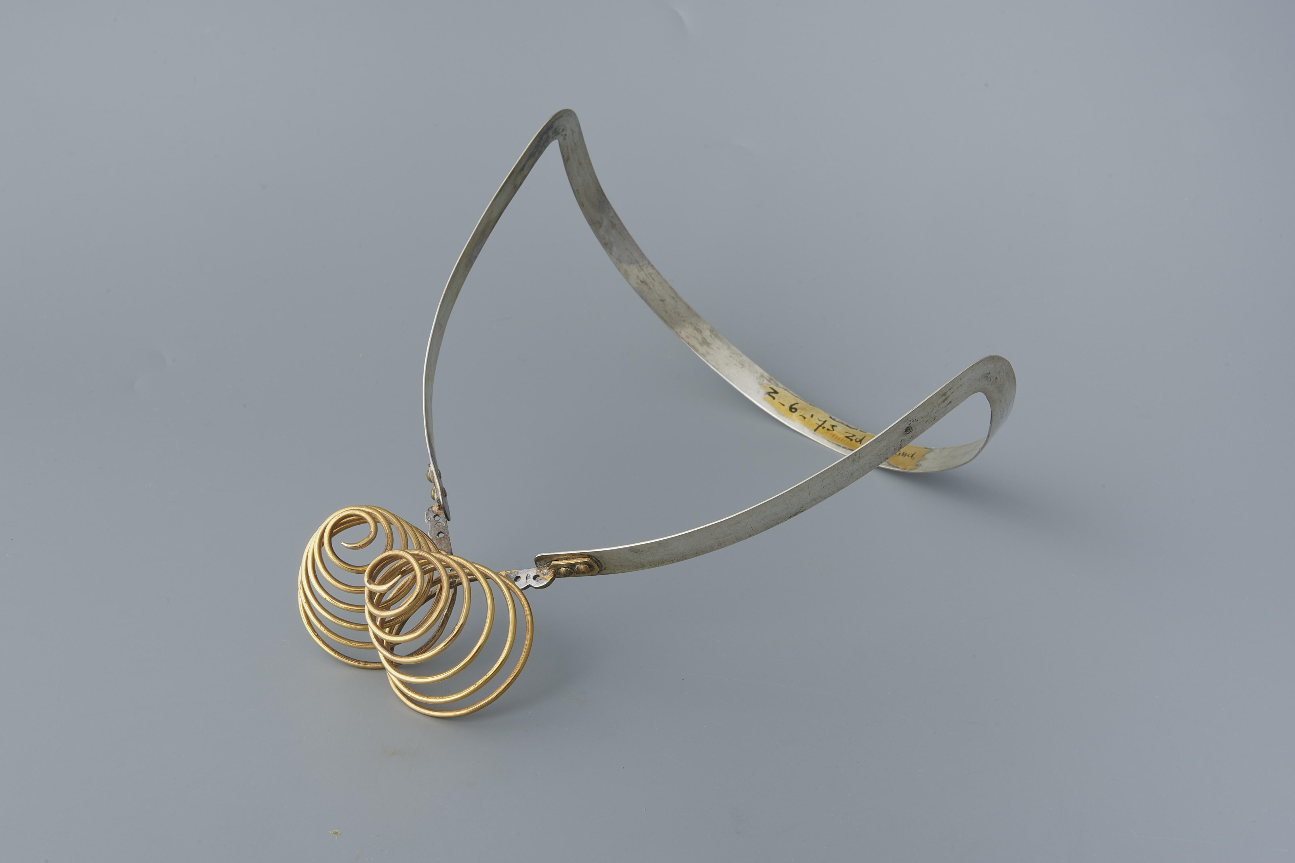 Een oorijzer, bestaande uit een smalle zilveren beugel waaraan twee gouden taps toelopende krullen met zes windingen zijn bevestigd. Deze krullen hebben de jaarletter M van 1896. De zilveren beugel heeft de letter O van 1898. De krullen van het oorijzer zijn gemaakt door de zilversmid H. van Aken uit Rotterdam. De beugel is vervaardigd ...