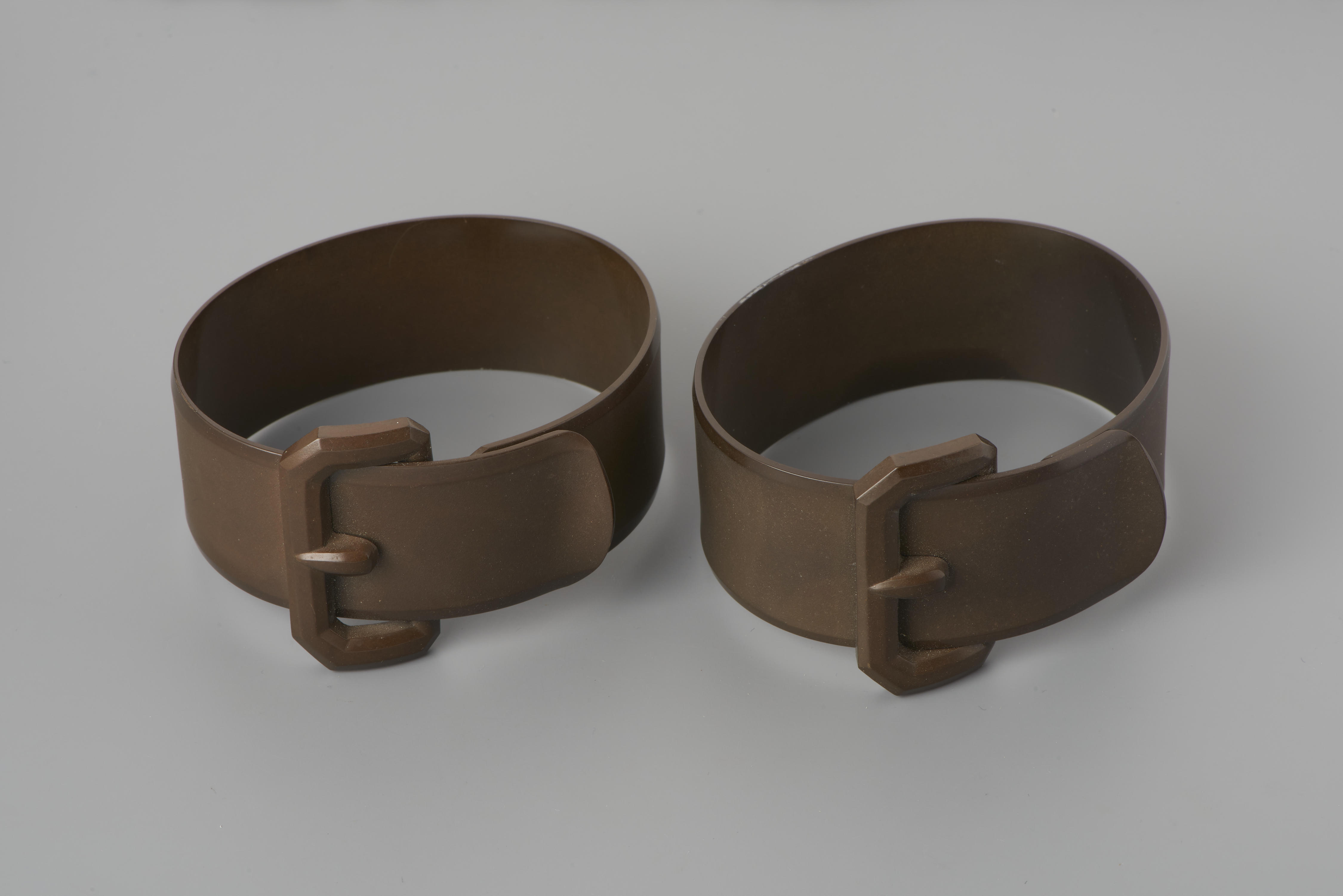 Bakelieten armbanden. De armbanden lijken een paar, maar in de breedte van de band zit een klein verschil. Dergelijke armbanden werden in Groningen gedragen bij de rouwdracht.