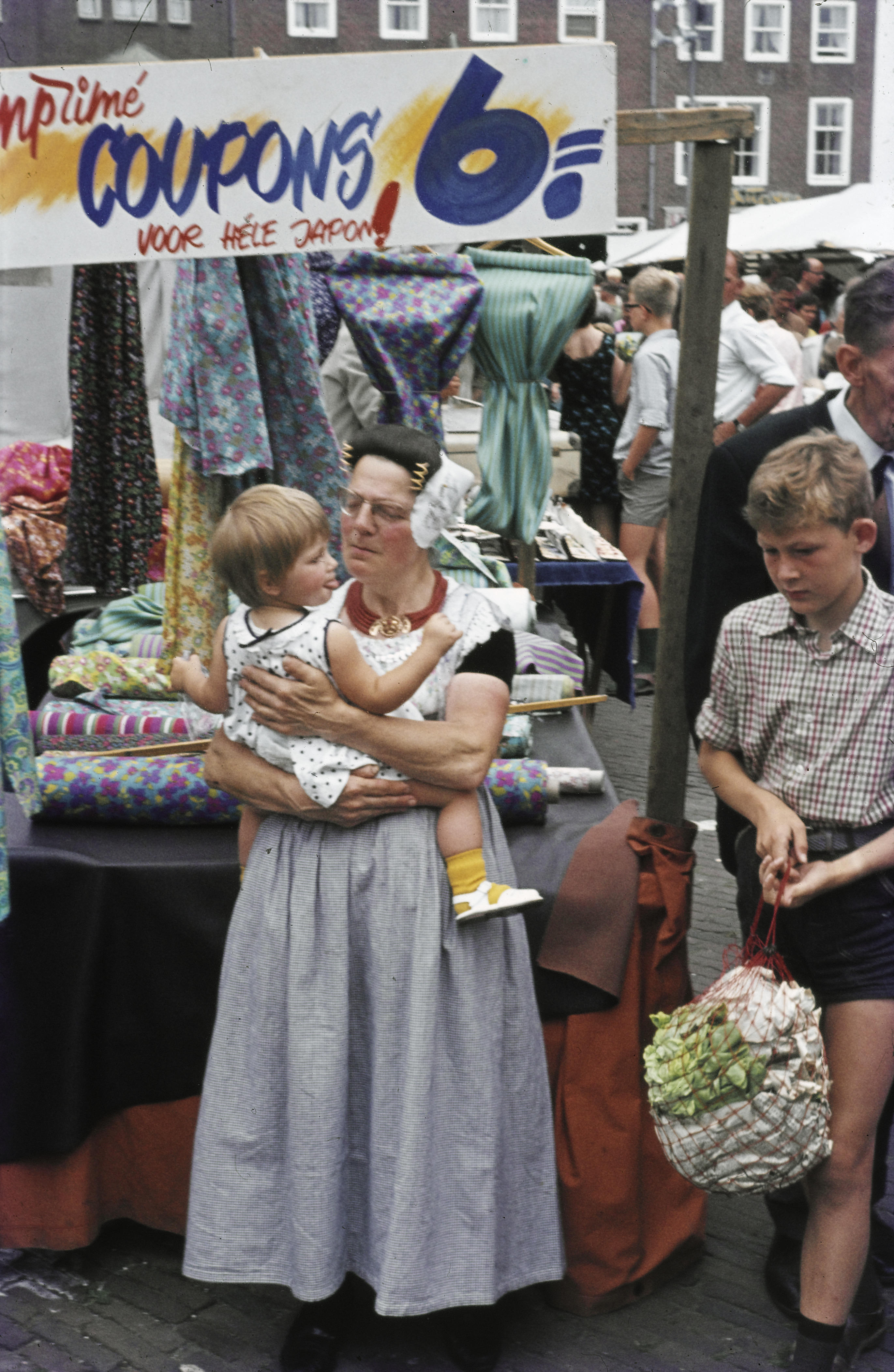 Vrouw in Walcherse streekdracht op de markt, 1969 (diapositief)