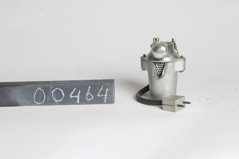 Dikowa doorstromer (miniatuur snelgeiser) met elektrische verwarming en een rond zwart apparaatsnoer met houten contactstop. In een cilindervormige chroom/alluminiumkleurig metalen behuizing voor direkte montage aan de kraan.