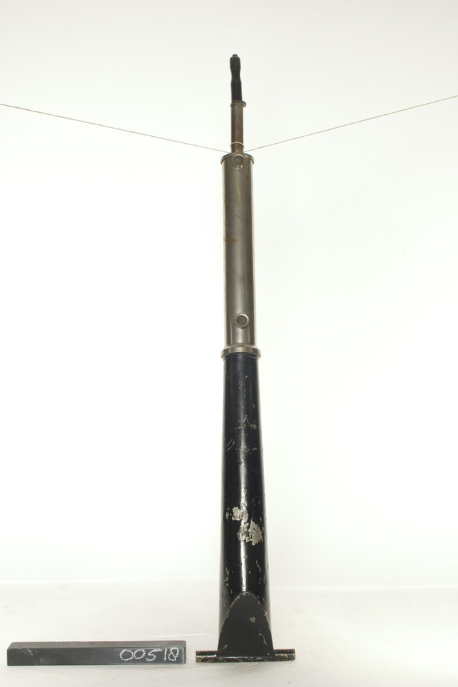 Onbekend fabricaat handpomp-steelstofzuiger. Het apparaat is lang en dun van vorm, met een verchroomde kokervormige bovenhelft (met zwart houten handvat) en een zwart gelakte onderhelft (met een dwars horizontale buis als mondstuk). De zwarte onderhelft heeft krassen en slijtageplekken.
