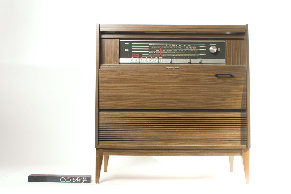 Grundig Mandello de Luxe radiogrammofoon. Bruine salonmeubel met radio en grammofoon, 110/220V - 30W, in kast van afgewerkt spaanplaat. Boven aan de voorzijde zit een bruin paneel met zeven vierkante knoppen, drie schuifknoppen en een grote draaiknop voor zenderkeuze (met daaronder de tekst 'STEREO'). Fabr.serienr: 050402. (speelt goed op alle banden; Dual-platenspeler, type 1211; wisselstift ...