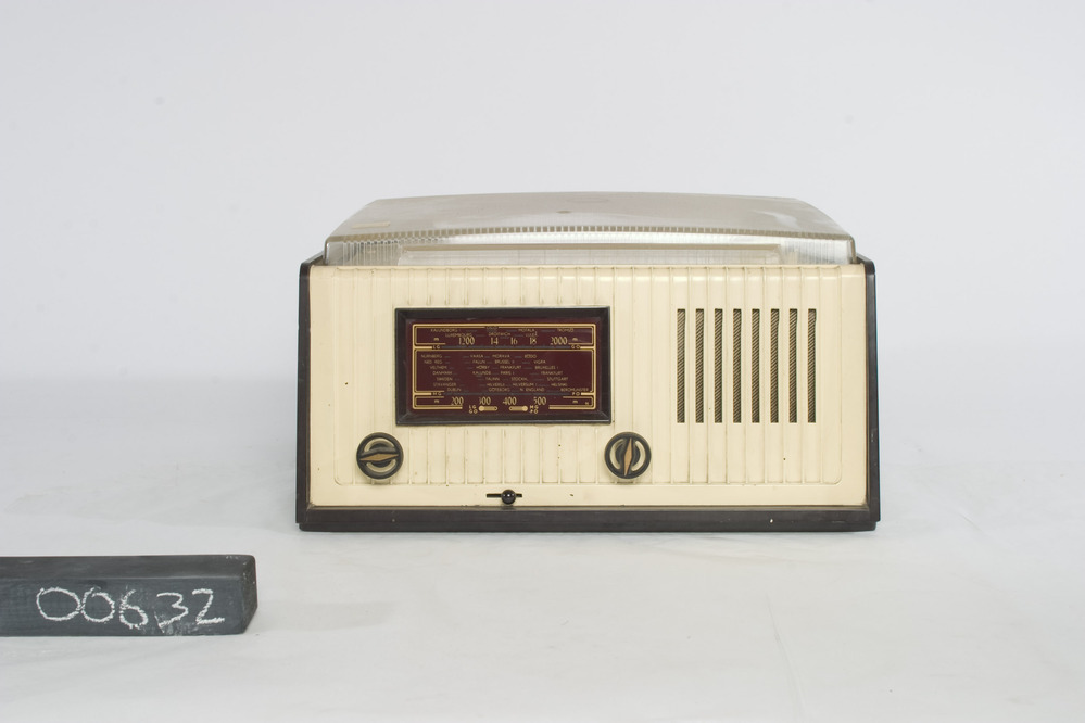 Philips HX348A omroepontvanger met ingebouwde platenspeler, 220V - 53W, in vierkante crèmekleurig kunststof kast met bruine rand en transparant bovenstuk. De kast heeft op het oppervlak verticale randen, een bordeauxrood paneel met gele opdruk, twee draaiknoppen, daaronder een kleine ronde zwarte schuifknop, en rechts acht verticale lange openingen voor de luidspreker. Fabr.serienr: A 30458. (radiodeel ...