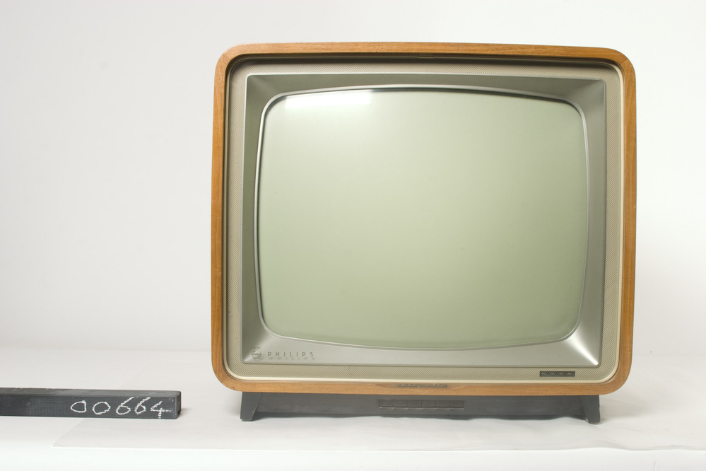 Philips 21TX370/05, zwart-wit televisietoestel, 220V - 200W, in houten kast met achterwand en serviceluik. Het toestel heeft drie randen om het scherm (eerst een egaal grijze rand, vervolgens een crèmekleurig raster, en als laatst de houten buitenkant). Onder het merkplaatje van Philips zit een zwart stuk waar het apparaat op rust, en waar zes horizontale ...