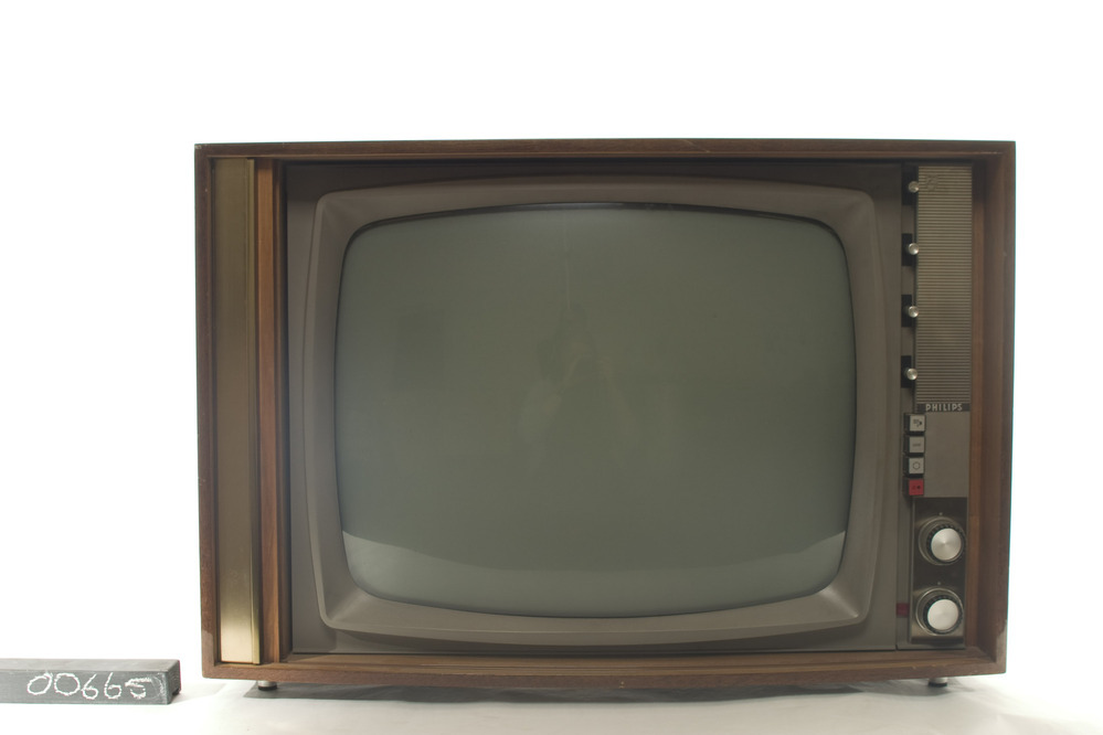 Philips Journal 23TA533A, zwart-wit televisietoestel, rustend op vier metalen noppen, in donkerbruin houten kast met achterwand en serviceluik. Het apparaat heeft aan de rechterkant een verticale luidspreker met vier kleine zilverkleurige draaiknoppen, dan het Philips logo met vier vierkante knoppen (drie grijs, één rood) en geheel onder twee grote zilverkleurige draaiknoppen met donkere rand. 220V ...