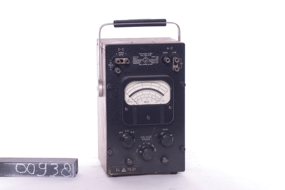 General Radio Co. 1800 A buis voltmeter met analoge wisselstroom/DC voltmeter, AC schaal: 0 0.5, 0 5, 0 15. gelijkstroom schaal: 0 5, 0 15. Meetbereik: 0.5/1.5/5/15/50/50V. In een rechthoekige zwarte bakelieten draagkast met handvat. Fabr.serienr: 1764.