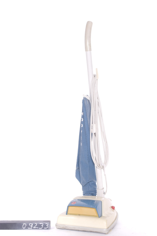 Hoover elektrische klopveegzuiger, met een wit/geel/blauwe kunststof kap over de motor, een blauwe stofzak en witte steel. Het apparaat heeft een wit snoer dat om de steel zit gewikkeld, en een rode knop op de witte kap.