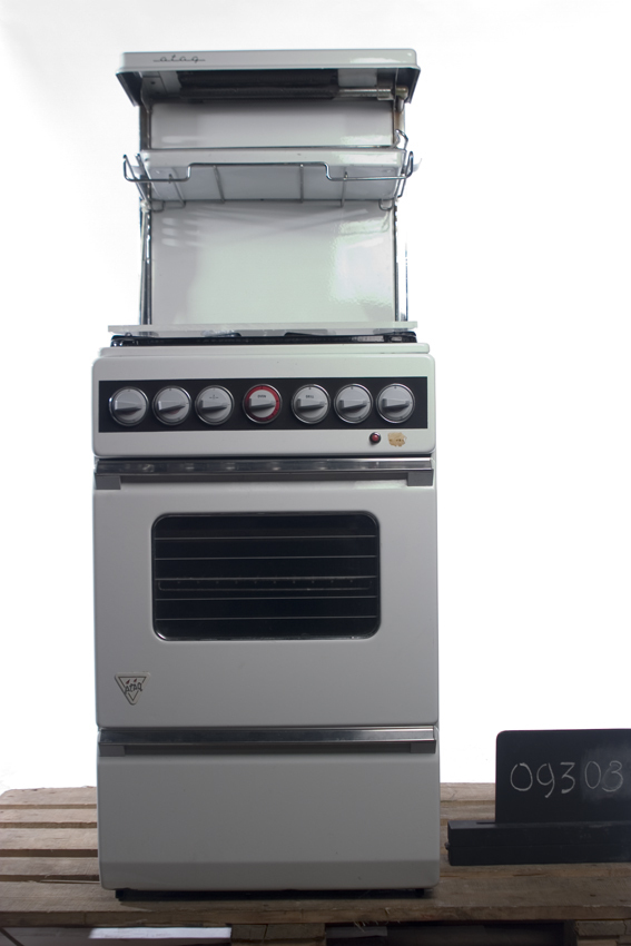 ATAG gasfornuis, grijs, met gaspitten, oven met transparant venster, bak en grillhouder. Het apparaat heeft zeven draaiknoppen (rode draaiknop in het midden voor de oven) op een zwart paneel. Serienr. 131566 met opbouw. Los 1 brander (tussenring mist).