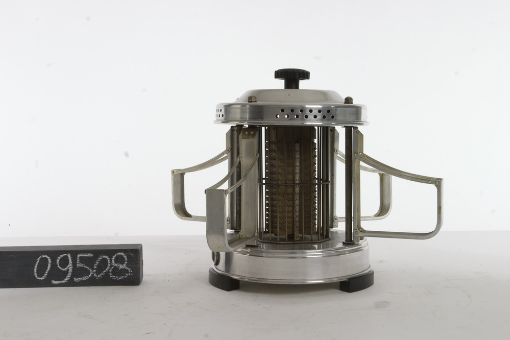 Elem broodrooster met elektrische verwarming door een centraal verticaal geplaatst rond element, 1200W. In een cilindervormige aluminium metalen behuizing, met rondom vier, verticaal scharnierende, houders, waarin plaats voor elk één boterham. Deze worden allereerst éénzijdig geroosterd. Daarna draait men aan de zwarte bakelieten knop in het deksel waardoor de houders met boterhammen gaan omklappen. Hierdoor ...