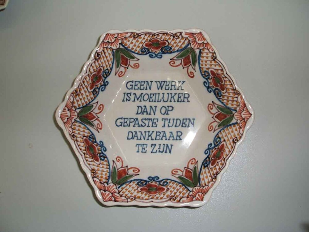 Zeskant schaaltje met veelkleurig zesdelig ornamentaal decor met centraal een spreuk.
