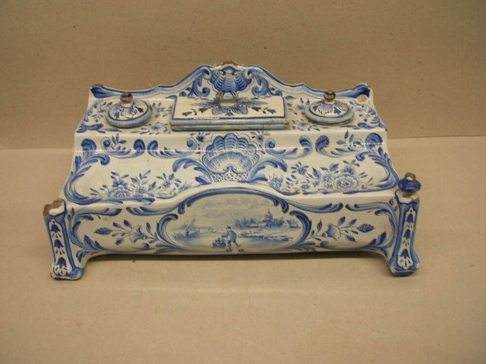 Inktstel, met blauw floraal en ornamentaal decor. Het stel heeft drie losse bakjes met deksels (een pennenbakje en twee ronde inktpotjes. Op de zijden in een cartouches voorstellingen van een landschap.