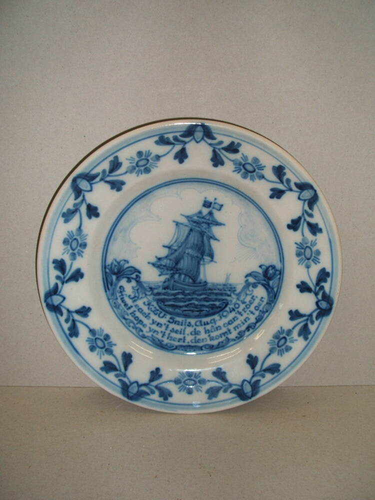 Bord, met decor in blauw. Op de rand een zevendelig floraal ornamentaal decor en centraal een voorstelling van een zeegezicht met schip en in een cartouche de tekst; K.Z.V. Snits, Aug. 1940 / It each yn't seil, de hân oan 't roer, / Hwet hope yn't hert, den komt min 't oer. Gemaakt als prijs ...