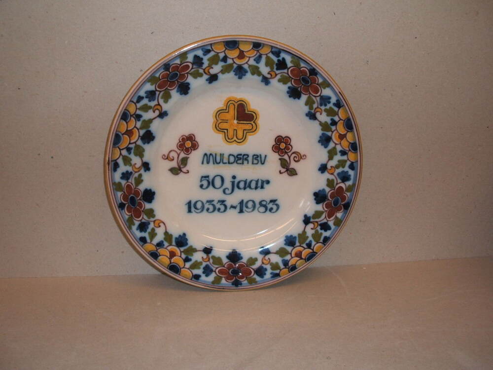 Bord, met veelkleurig decor. Op de rand een vijfdelig floraal decor en centaal een embleem van de frma Mulder en daarbij twee simpele bloemen en de tekst; MULDER BV / 50 jaar / 1933-1983