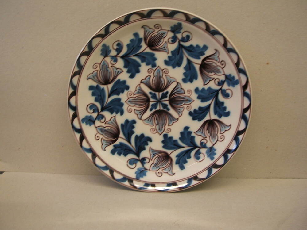 Schotel, met decor in blauw en paars. Op de rand een simpel ornamentaal decor en centraal een floraal / ornamentaal decor. Deze schotels zijn deel van de collectie schietgoed, eenvoudig gebruiksaardewerk uit de 19de eeuw. Op de achterzijde van dit bord de tekst; G. van Gemert / 1946 21 oktober 1971 / N.V. DE VITRITEFABRIEK
