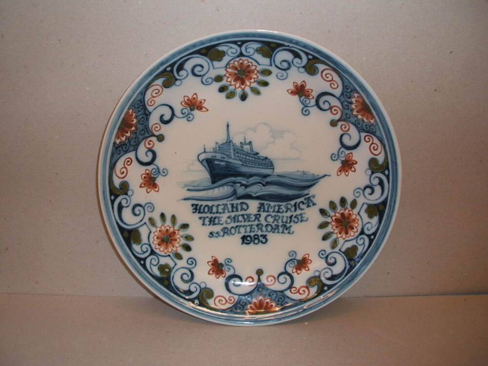 Bord, met veelkleurig decor. Op de rand een driedelige ornamentrand en centraal een voorstelling met een groot schip met eronder de tekst; HOLLAND AMERICA / THE SILVER CRUISE / s.s.Rotterdam / 1983. Gemaakt in opdracht van de Holland America Line (HAL).