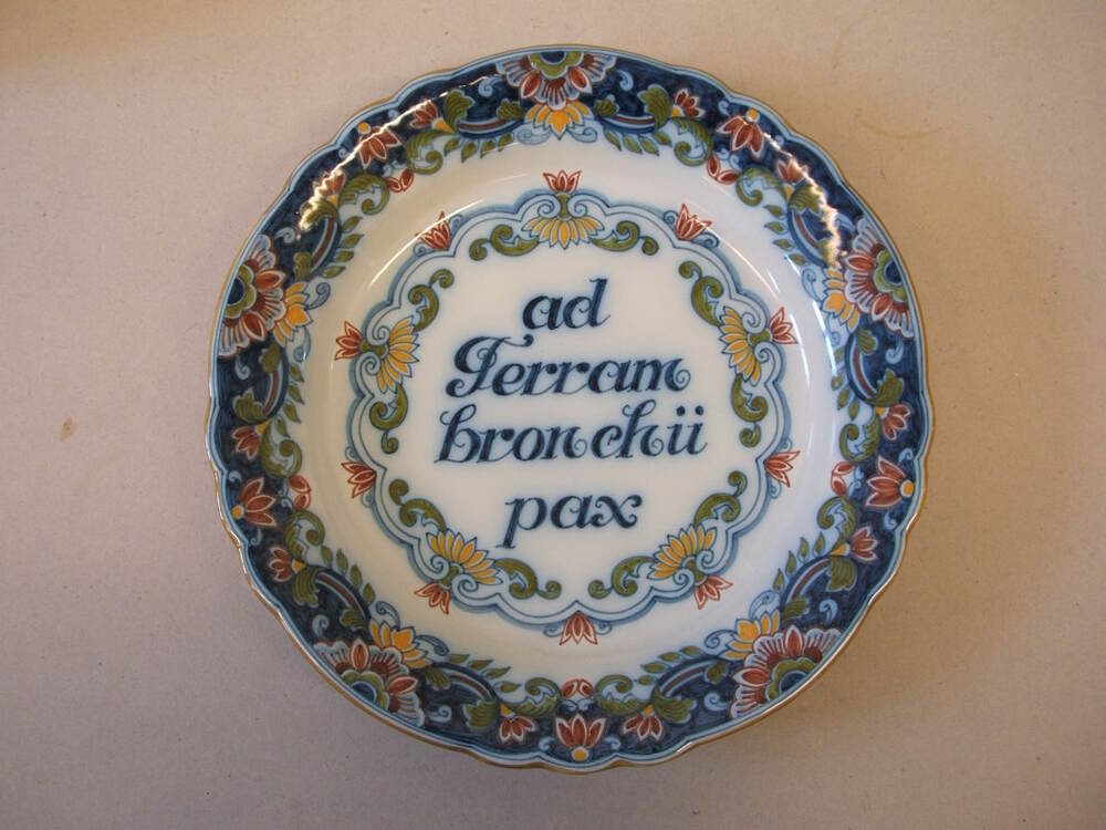 Schotel, spreukschotel, met veelkleurig decor met een gele bies op de buitenrand. Op de rand een vijfdelig ornamentaal decor en centraal binnen een smal ornamentaal decor de spreuk; ad / Terram / bronchii / pax. Het decor op de schotel is hetzelfde als dat van 1094, maar met een andere spreuk.