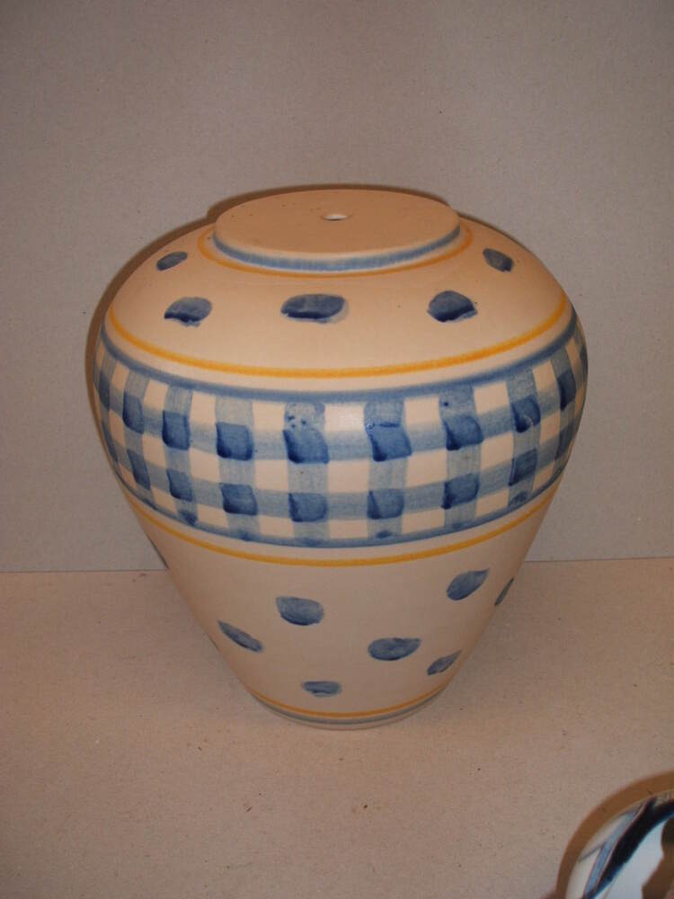 Lampvoet in het model van een grote snuifpot. Gemaakt in opdracht van een exclusieve lampenwinkel in Den Haag. Deze winkel is zelf met decors aangekomen die ze passend bij de kappen op de voeten aangebracht wilden hebben. Dit exemplaar is uit 1983