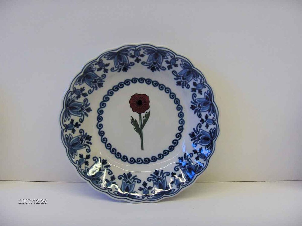 Gelegenheidsopdracht. Schaaltje met blauwe rand en meerkleurige klaproos en achterschrift