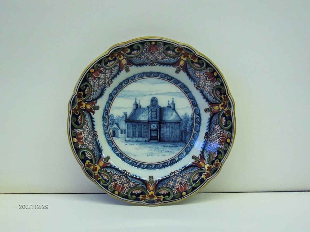 Gelegenheidsopdracht, relatiegeschenk. Bord, zevendelige veelkleurige rand, met afbeelding van gebouw