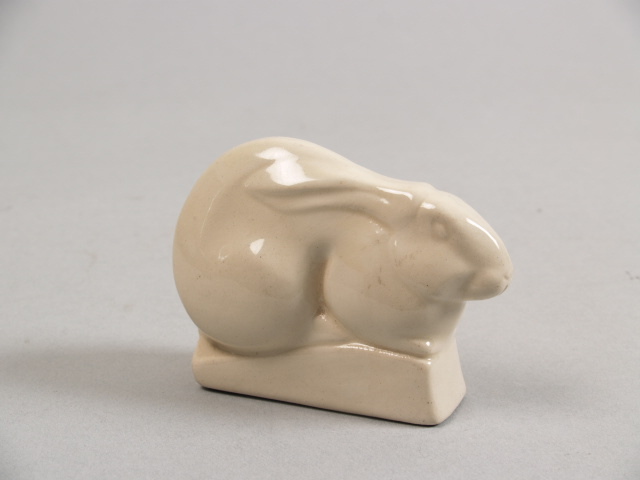 Beeld van wit geglazuurd aardewerk in de vorm van zittend konijn met de oren rustend op de rug, op rechthoekig voetstuk