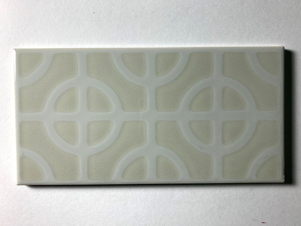 Grijsrose scherf met twee glazuren, een grijze en een beige. Versiering: vierkanten met telkens, halverwege de zijden, kruisende ringen