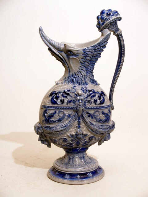 Snavelkan met reliëfdecor in grijs en blauw van ranken, guirlandes en fantasiefiguren