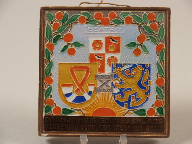 Herdenkingstegel met floraal decor en 3 wapenschilden, te weten van Oranje, van Prinses van Oranje en van Von Lippe Biesterveld en tekst Beatrix 31 januari 1938 Oranjehuis en Nederland Verenigd door een nieuwen band"