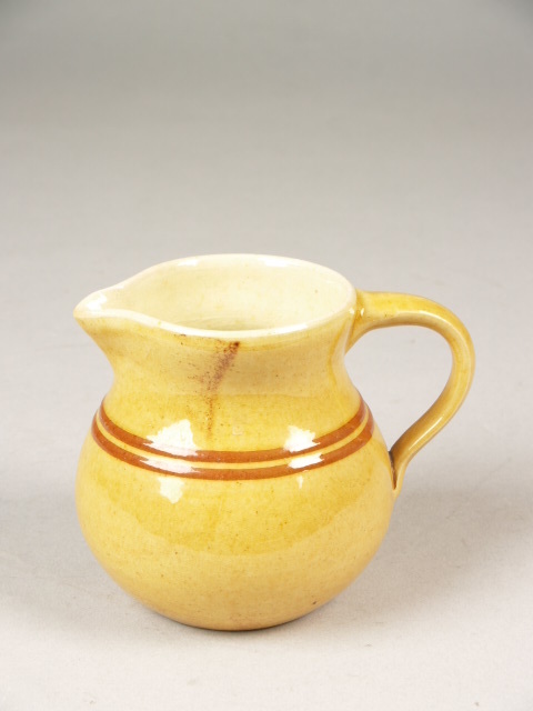 Kan met bolle buik, rand met sneb en staand oor. Geel geglazuurd met op schouderhoogte 2 horizontale bruin banden