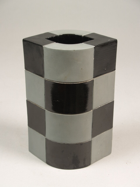 Vaas met bolle wanden en samengeknepen hoeken. Opgebouwd uit 16 bolle elementen, afwisselend matgrijs en glanzend zwart geglazuurd