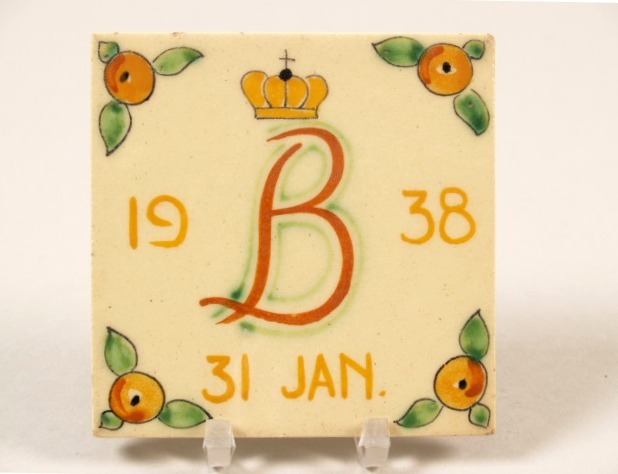 Herdenkingstegel met decor van 4 appels, kroon en letter B met tekst 1938 31 jan.