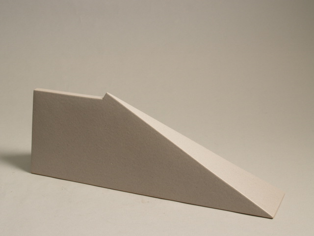 Object bestaande uit een rechthoekige asymmetrische vorm met naar boven sterk verjongende wanden en bedekt met lichtgrijs glazuur