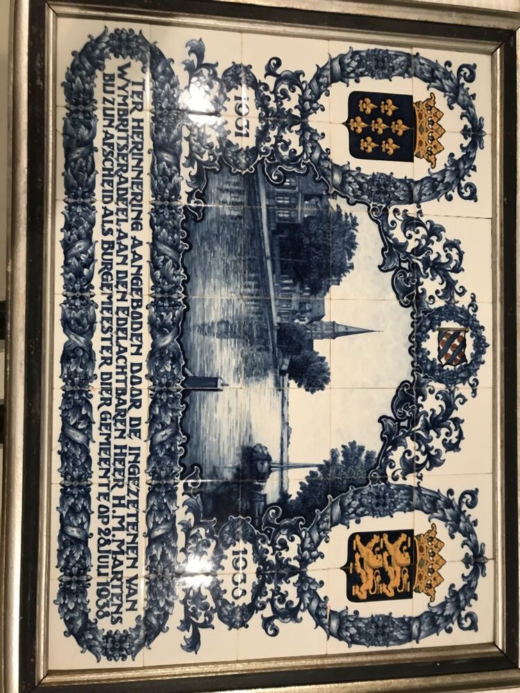 Tegeltableau met een centraal decor van een waterlandschap in een cartouche omkaderd door 6 cartouches met tekst, jaartallen, twee wapens en de Friese vlag