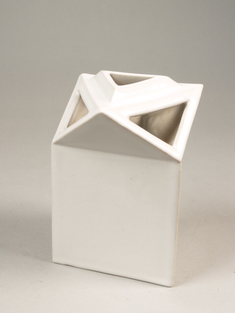 Driehoekige vaas met opbouw, waarin vier driehoekige openingen zijn aangebracht. Het geheel is wit geglazuurd