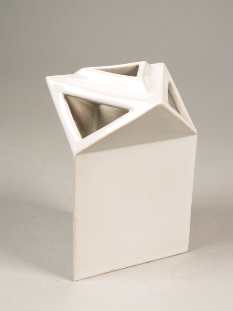 Driehoekige vaas met opbouw, waarin vier driehoekige openingen zijn aangebracht. Het geheel is wit geglazuurd