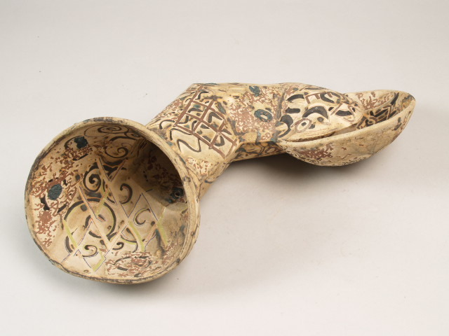 Beeld in de vorm van een ellebooggewricht, met aan de uiteinden komvormen. Overdekt met abstracte decoratie in zwart, groen en bruin met letters en ingelegde stukken klei