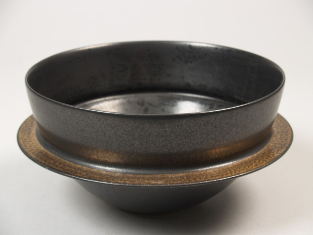 Kom, bol, deel overdekt met antracietkleurig glazuur met goudluster